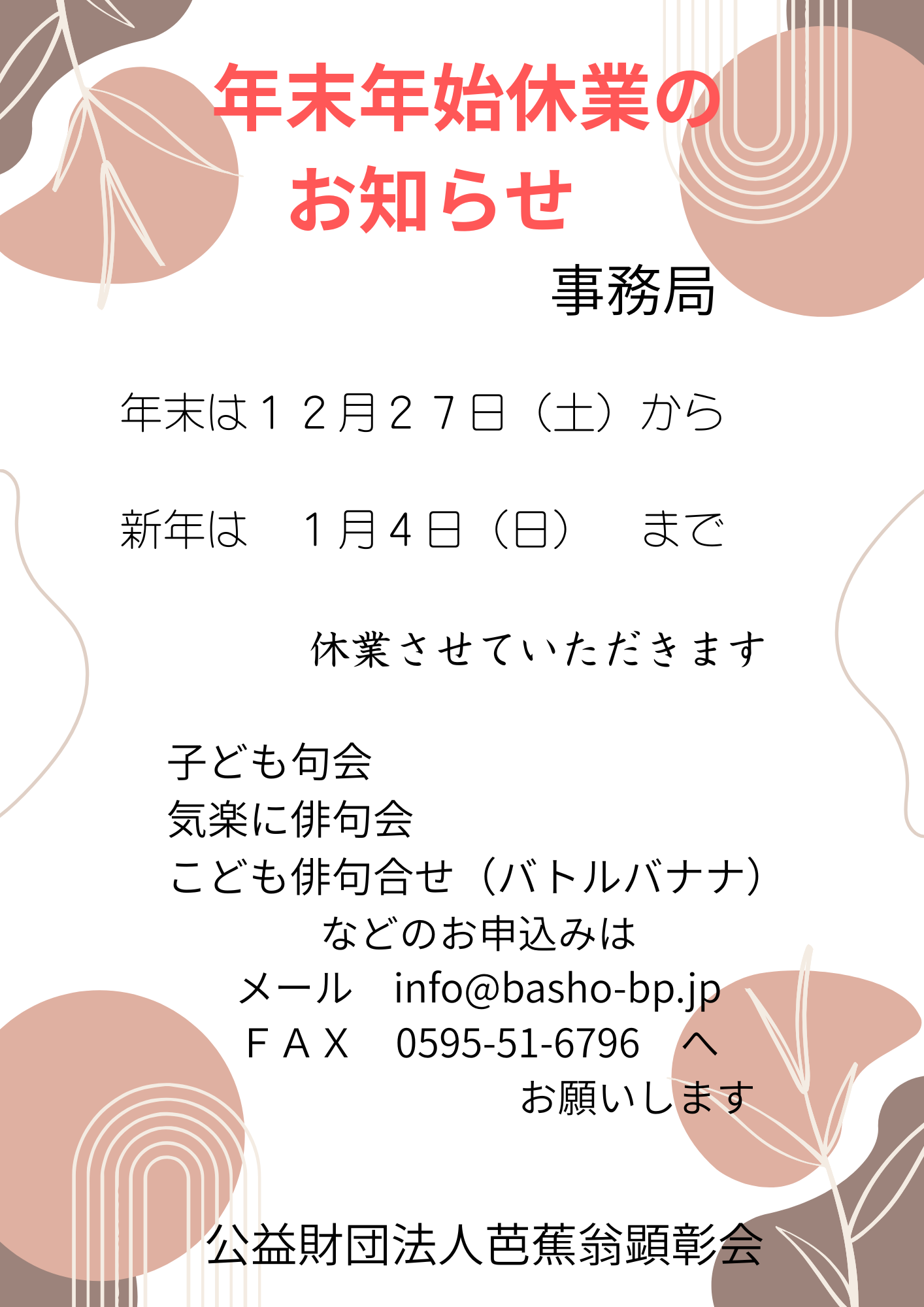 年末12月7日(土)から新年1月4日(日)まで 不在です。